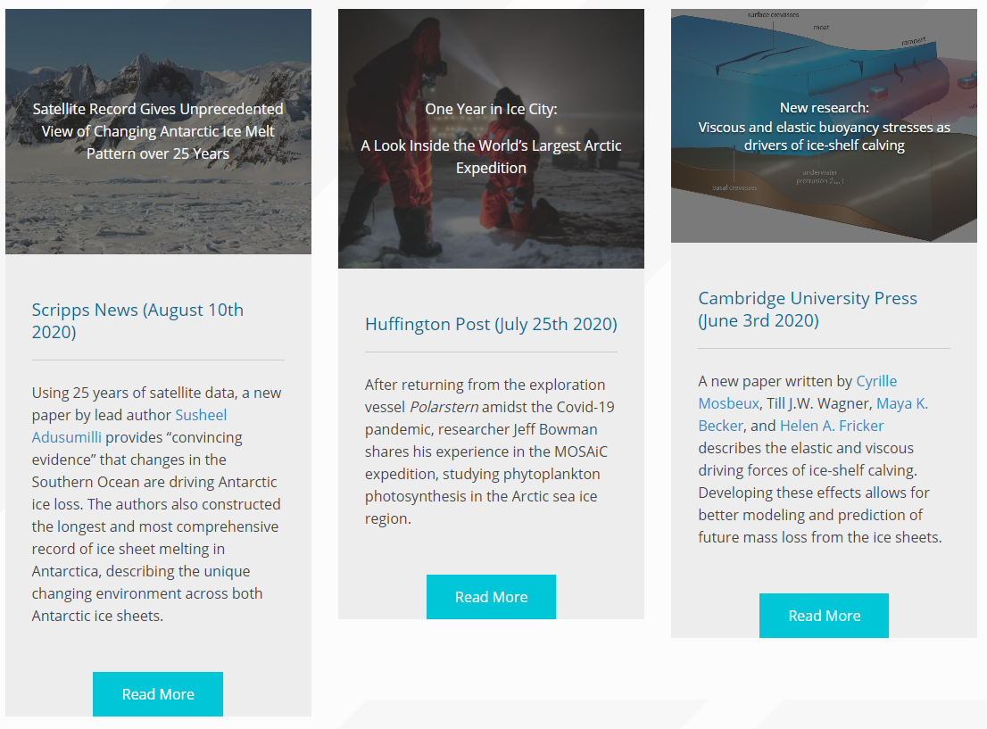 The Polar Center is a multi-disciplinary research group at SIO that brings together polar science researchers of various backgrounds. There was need for a web developer to maintain the website and also understand and communicate the science involved, so I managed polar.ucsd.edu from January 2020 to June 2021. Here are some of my additions and changes to the site: